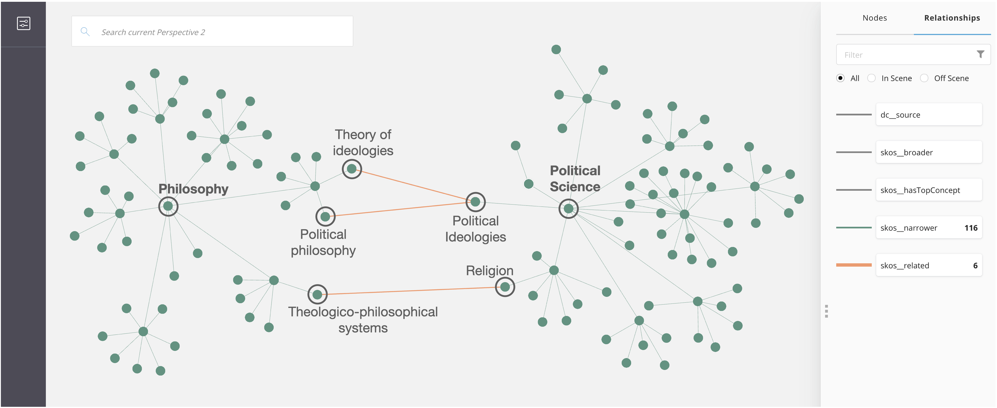 In addition to the hierarchical relationships, there are skos:related relationships connecting transversally related concepts in different taxonomies and acting as bridges across subtrees. Here is an example of how Political Science (UNESCO code 59) relates to Philosophy (UNESCO code 72). Note the skos:related relationships displayed in orange.