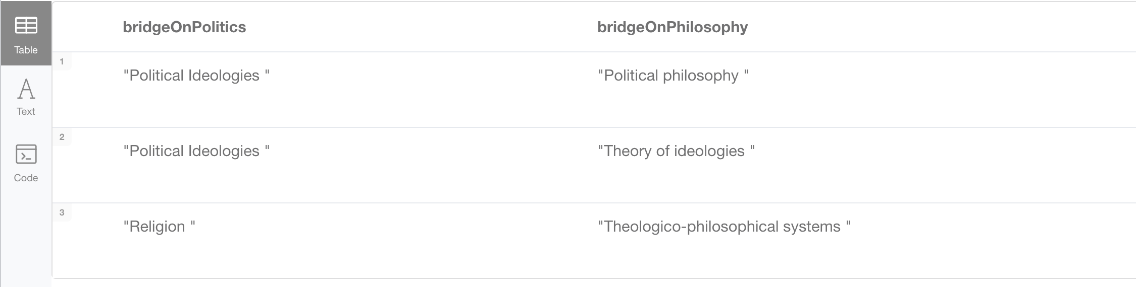 RETURN DISTINCT n10s.rdf.getLangValue("en", bridge1.skos__prefLabel) as bridgeOnPolitics, n10s.rdf.getLangValue("en", bridge2.skos__prefLabel) as bridgeOnPhilosophy
