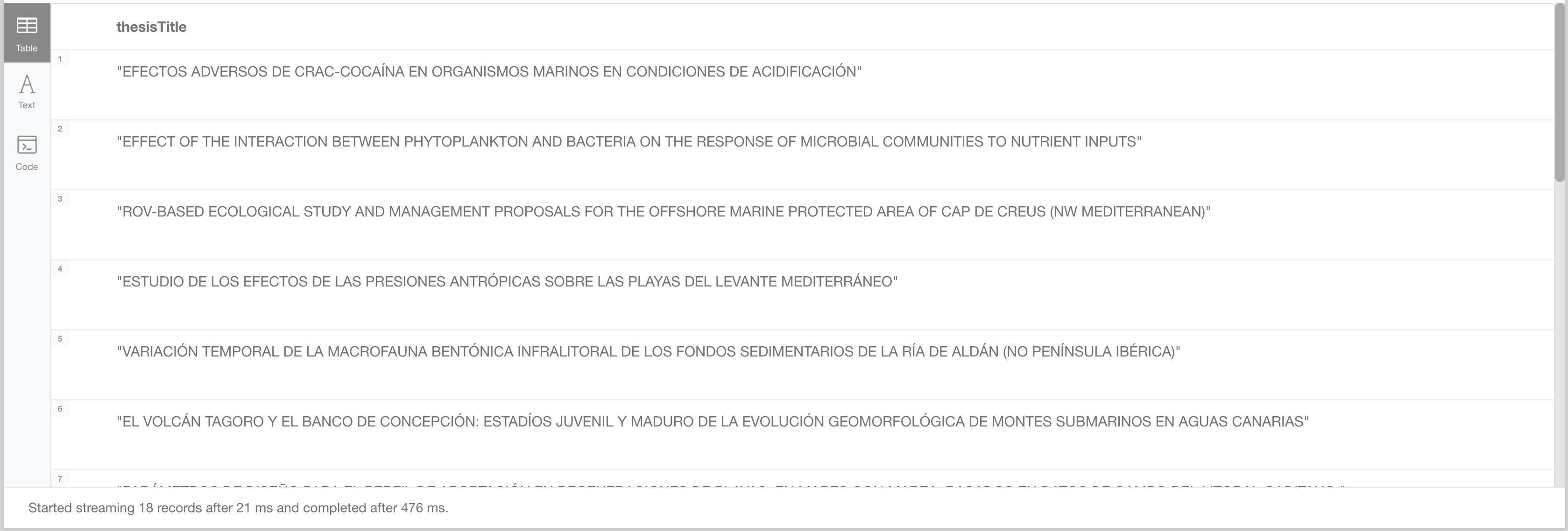 We can see that the query starts with a topic search by English name in the UNESCO nomenclature, and with the results, the HTTP request is constructed to return the matching theses (titles). The previous query return a list of 18 results. Note that the search is restricted to the theses published from 2015.
