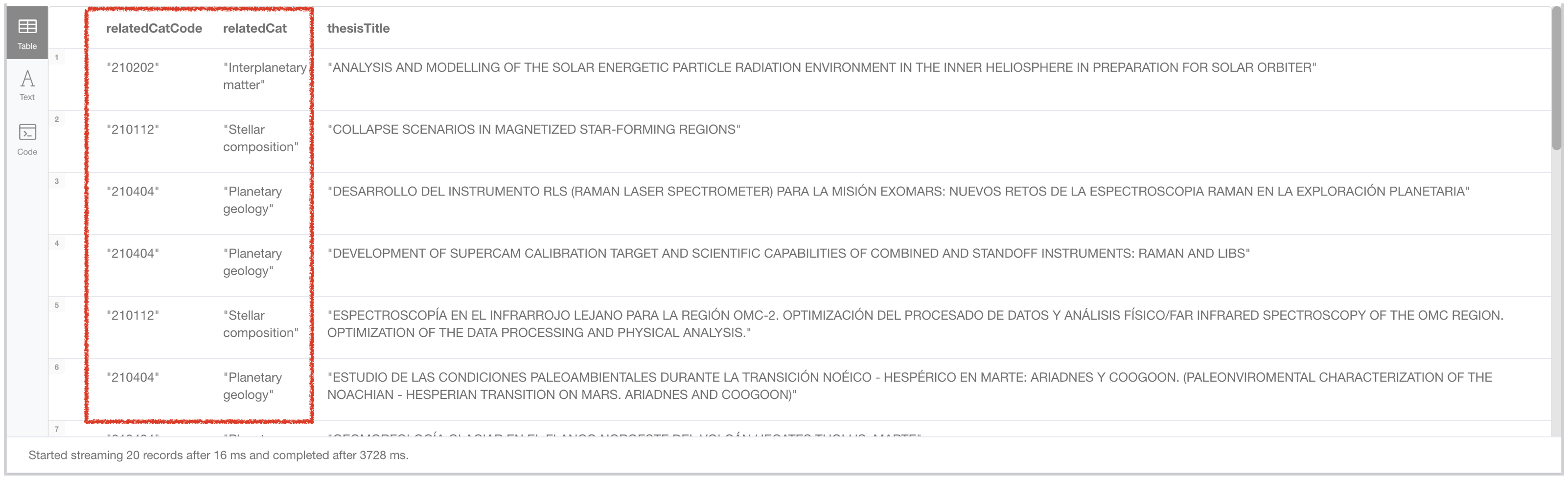 …and issues a request to the Teseo DB for each related topic. The result is some additional items that could be used to populate a “you may also find interesting the following results”. We can see in the table below with the results of the previous query that it includes PhD theses in the topics represented by the related nodes in the graph (“Stellar composition”, “Planetary geology”, and “Interplanetary matter”). Note that the query only returns the additional results (the related ones) but not the ones tagged explicitly with “Cosmochemistry”.