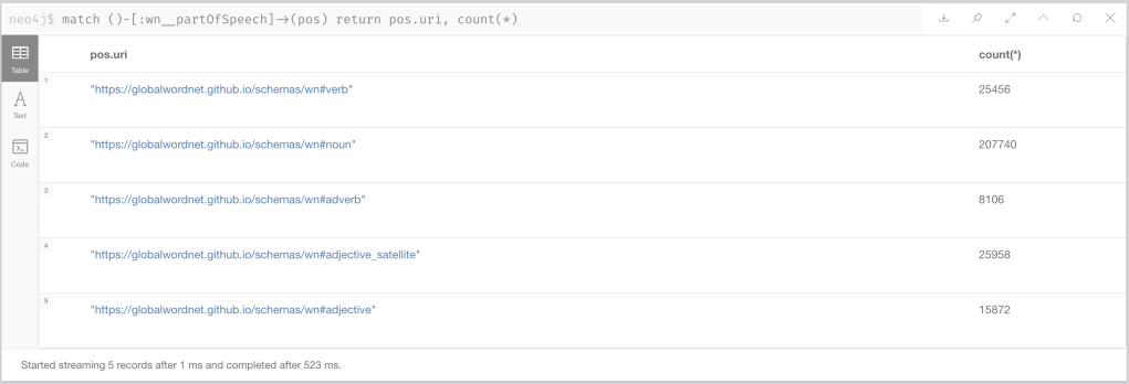 Let’s start by having a look at the POS (part of speech) nodes. There are five of them: noun, verb, adverb, adjective and adjective_satellite and there are tens of thousands of both Lexical entries and lexical concepts linking to them through the partOfSpeech relationship. You can get a summary of this with this query: