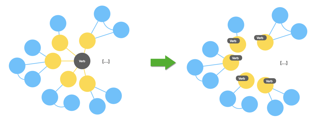 In the Property Graph model we have labels to classify nodes and in this particular case they are a much more efficient mechanism to “tag” a node (both lexical entries and lexical concepts) with their POS. The following image captures visually the refactoring that we are about to carry out: