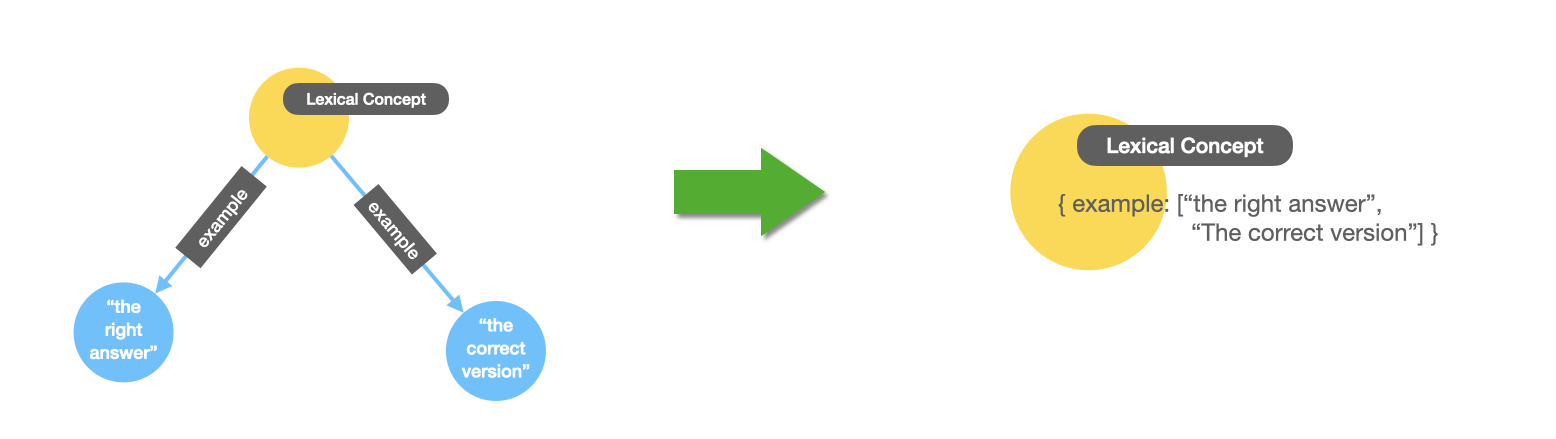 A small variant of the previous pattern is the case of the examples for LexicalConcepts, we want to refactor them into properties of the LexicalConcepts like in the previous two cases, except that in this case there can be multiple values so we need to construct an array from it. Something like this: