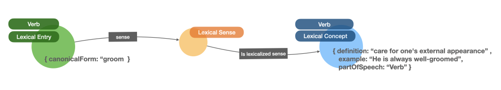 The main structure of the graph is as follows: LexicalEntries are connected to one or many LexicalSenses through the sense relationship, and LexicalSenses have one and only one LexicalConcept associated. The last two are linked through the is lexicalized sense relationship. Here’s what it looks visually: