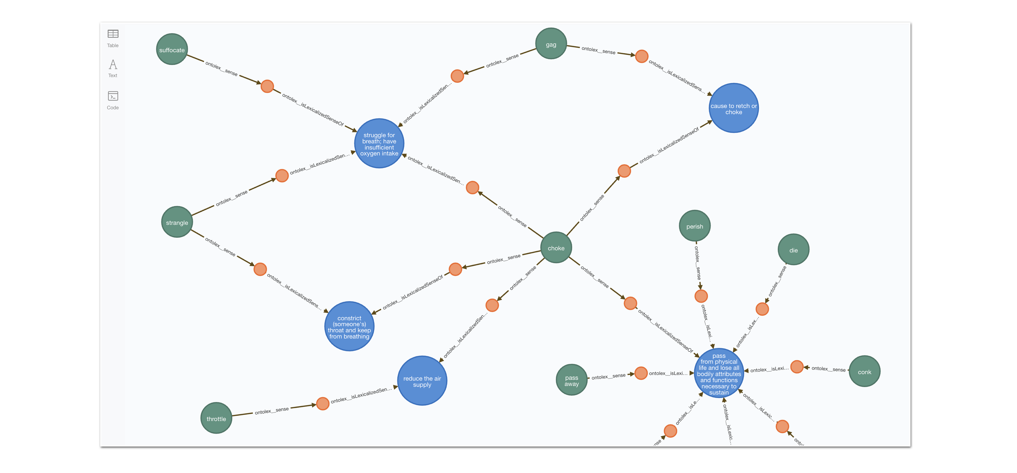 And here is a fragment of the graph where we can see how multiple Lexical senses converge on the same Lexical Concept, and similarly different senses for the same entry connect it to different Concepts: