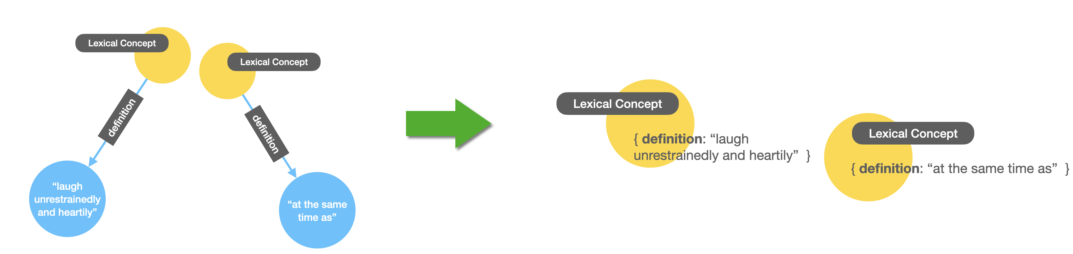 Every lexical concept has one and only one definition, represented in the RDF graph as a separate node with a single literal property containing the text representation of this form. This is not a very practical way to do it and we can make it a lot more compact by transforming the definition into a property of the lexical concept node. Here’s what I mean visually: